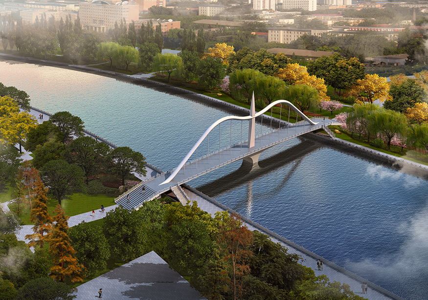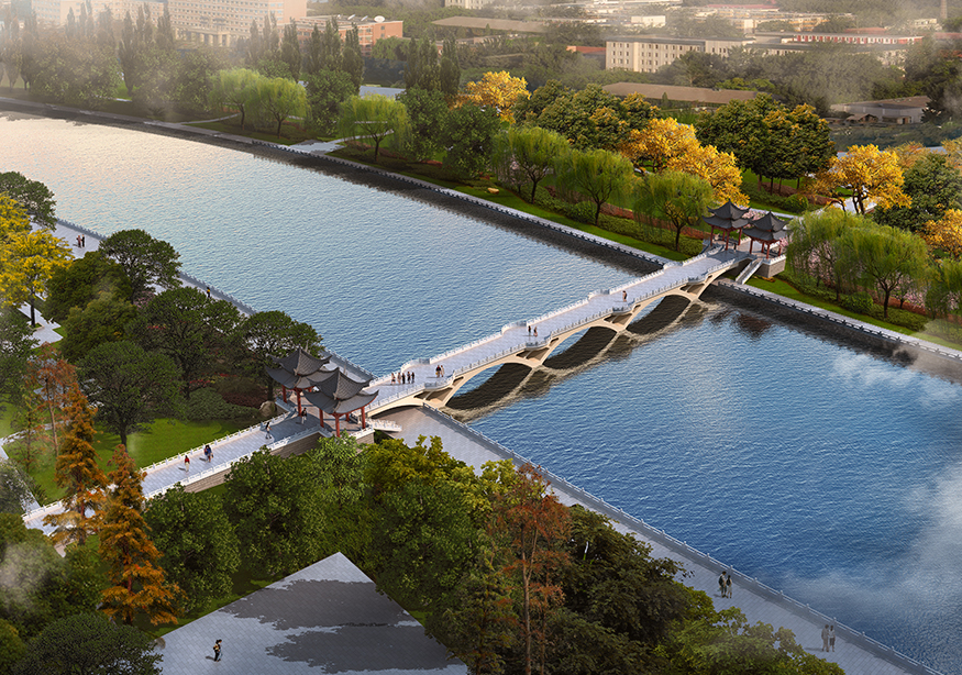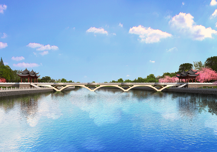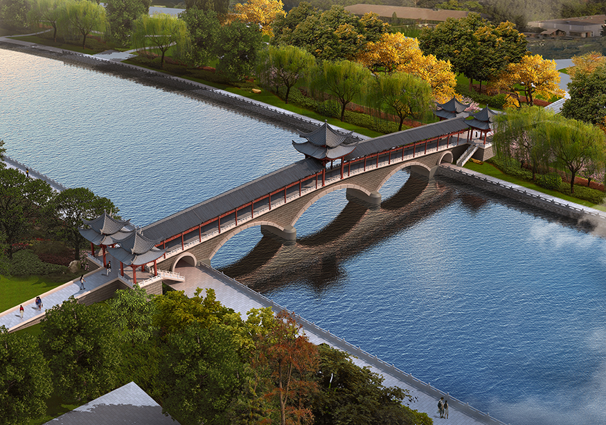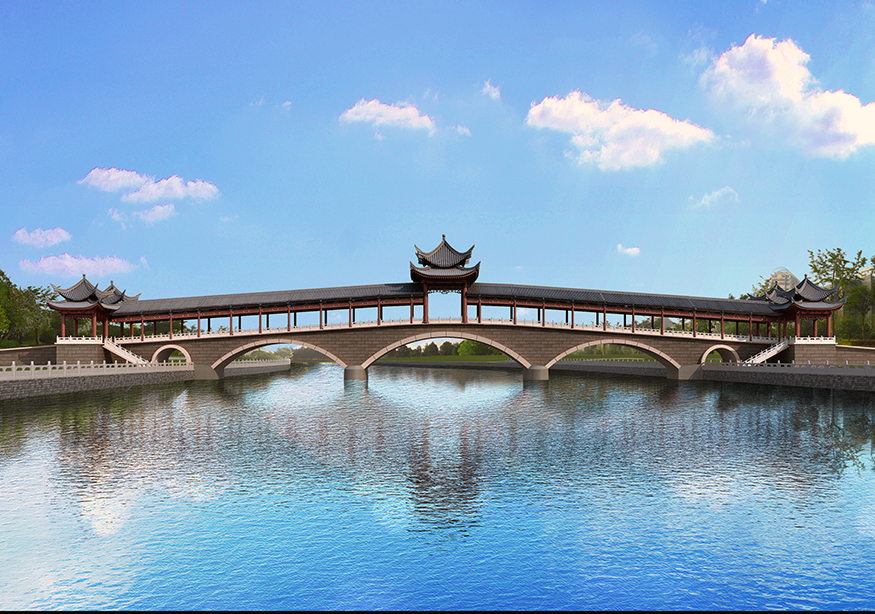 橋上亭廊形式采用江南園林風(fēng)格形式,配合下部的景觀仿石拱橋,典型的江南水鄉(xiāng)風(fēng)格;為體現(xiàn)當(dāng)?shù)孛晒抛宓奶攸c(diǎn),可在橋梁欄桿欄板側(cè)面及亭廊頂?shù)南虏康窨?、繪制一些能夠體現(xiàn)蒙古族文化特點(diǎn)的圖案,如騎射、摔跤等。江南文化與蒙古文化在橋上的相互融合統(tǒng)一,充分體現(xiàn)了援建的友誼。