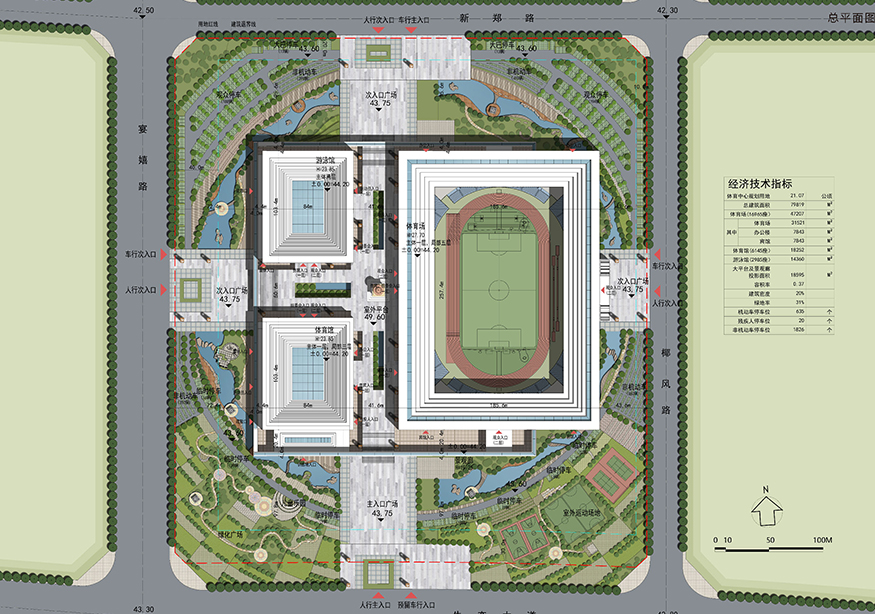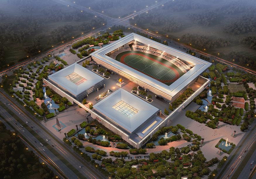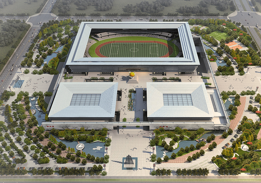 單體,建筑總面積約為62295㎡,包含體育場一座(占地約15100㎡)、體育館一座(占地約5123㎡)、游泳館一座(占地約1158㎡),可以滿足并承接省級(jí)比賽的賽事要求。另約有3015㎡的配套商業(yè)用房,預(yù)留為體育中心建設(shè)停車場、全民健身廣場、公園綠地等服務(wù)設(shè)施和配套設(shè)施。