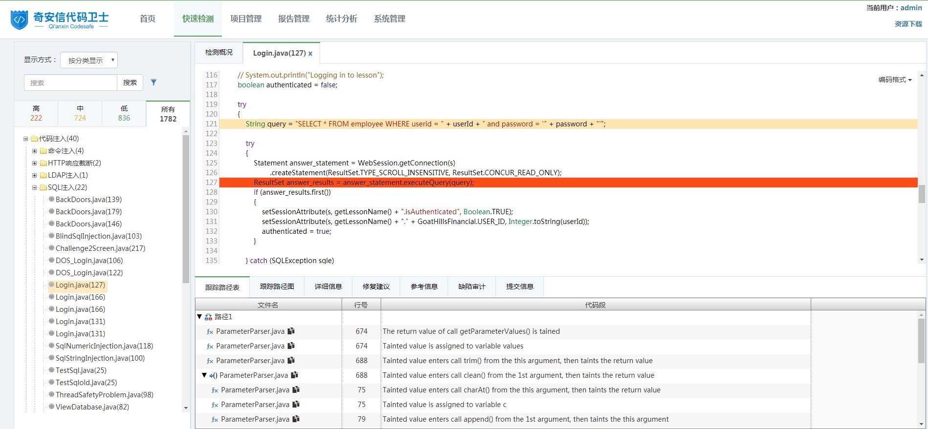 代碼衛(wèi)士通過源代碼靜態(tài)分析技術(shù)對(duì)軟件源代碼進(jìn)行自動(dòng)化分析,從源代碼層面發(fā)現(xiàn)軟件中的安全缺陷。目前支持C、C++、Objective-C、C#、Java、Java(Android)、JavaScript、PHP、Swift、Go、Python、Cobol、TSQL、PL/SQL、JSP、ASPX、Node.js、Vue.js、React.js、HTML、XML等多種編程語言開發(fā)的軟件源代碼的缺陷檢測(cè),其中包括1300多種源代碼缺陷類型,兼容CWE、OWASP TOP 10等國(guó)內(nèi)外相關(guān)安全開發(fā)標(biāo)準(zhǔn)或規(guī)范。