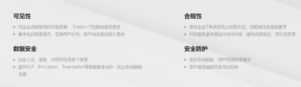 提供對云應(yīng)用的可見性、合規(guī)性、數(shù)據(jù)安全、安全防護(hù)等幾方面進(jìn)行全方位的安全防護(hù),與ASWG產(chǎn)